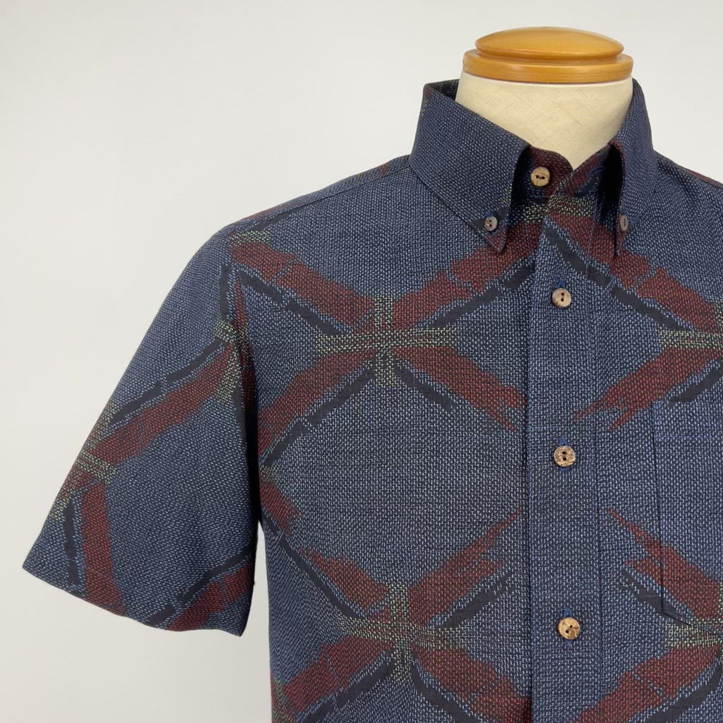 着物アロハシャツ ネイビー・斜め格子 L22-90