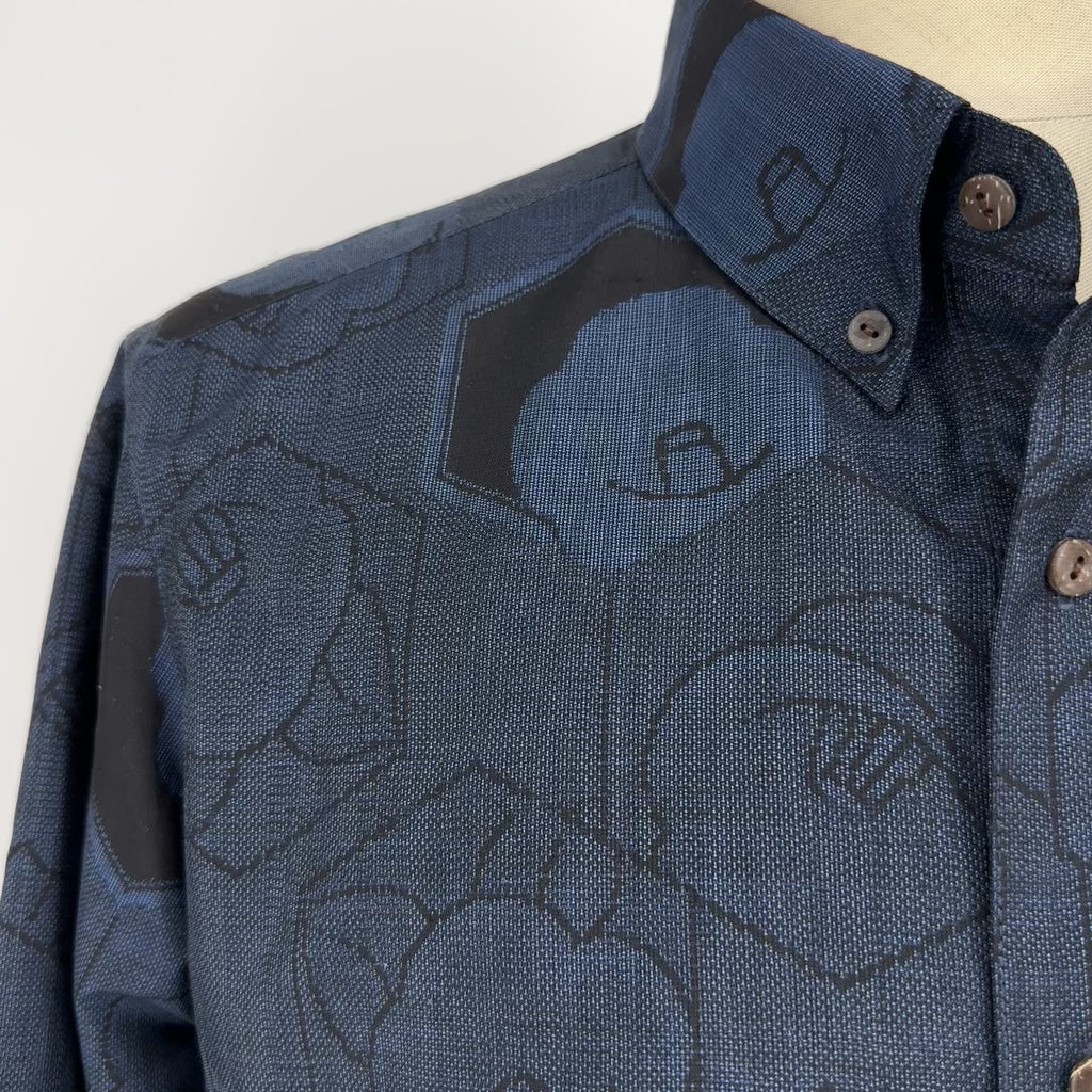 着物シャツ 長袖 ネイビー・亀甲に椿 大島紬 XL23-21